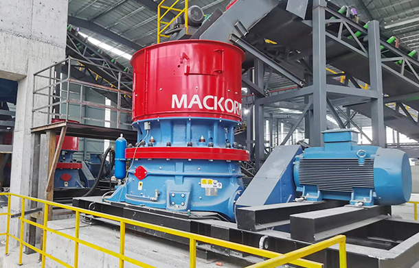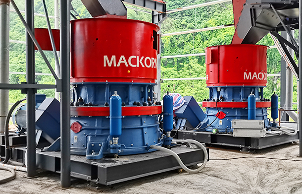 電機(jī)經(jīng)由大小齒輪帶動(dòng)偏心套組件旋轉(zhuǎn),由偏心套組件迫使主軸以懸掛點(diǎn)為中心,繞機(jī)器中心線旋擺運(yùn)動(dòng)。動(dòng)錐的運(yùn)行軌跡看起來是在破碎腔內(nèi)來回?cái)[動(dòng),同時(shí)緩慢的旋轉(zhuǎn)。物料被擺動(dòng)的動(dòng)錐擠壓破碎;